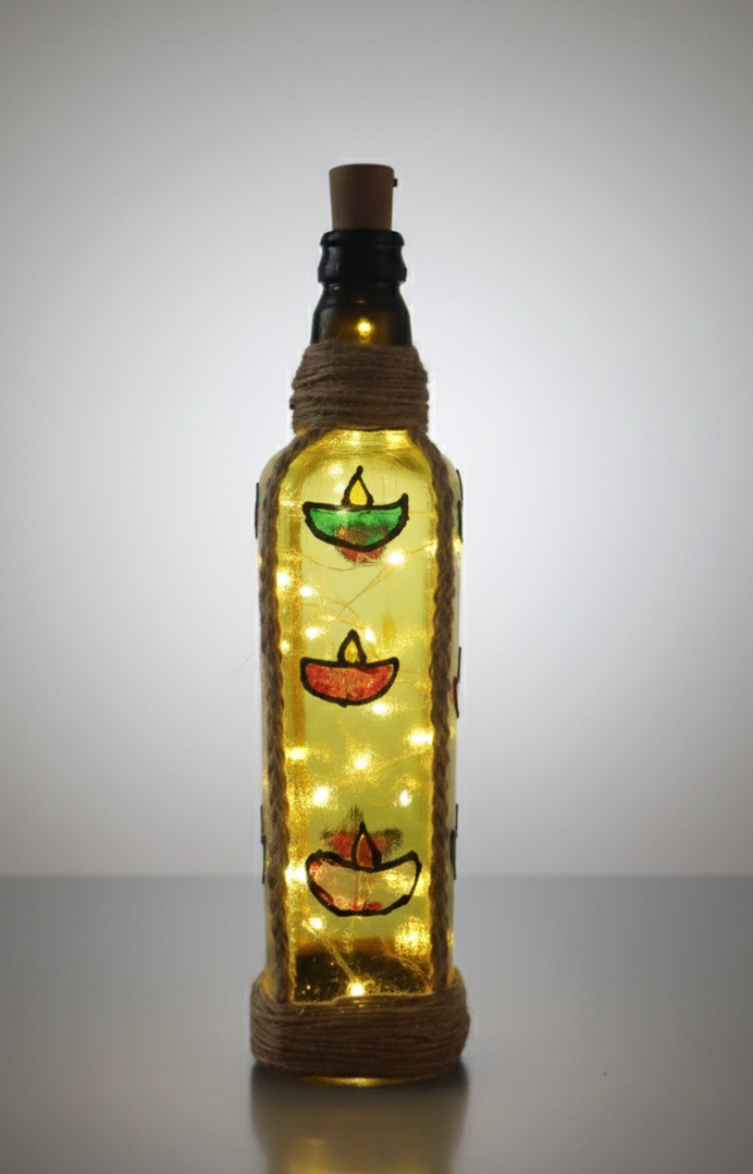Celebrate tradition with elegance using this handcrafted Diya design decorative bottle light. Designed with traditional diya motifs and warm LED fairy lights inside, this bottle lamp creates a soothing and festive ambience inspired by Indian culture.
