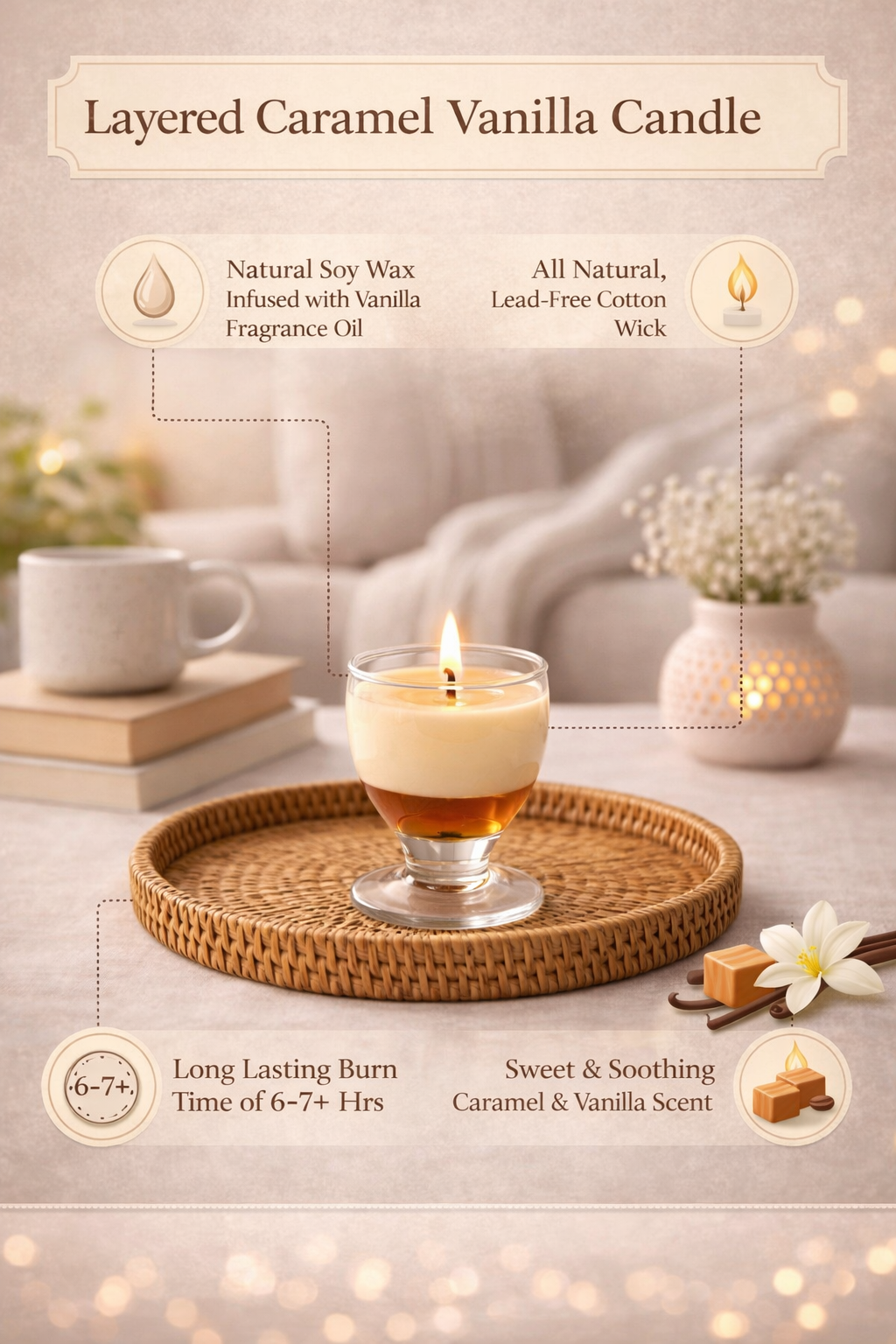 Enhance your home ambiance with this beautifully crafted luxury layered scented candle housed in an elegant glass container. Designed to combine aesthetics with functionality, this premium candle features a soothing vanilla fragrance that fills your space with warmth and relaxation.
