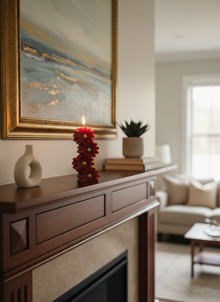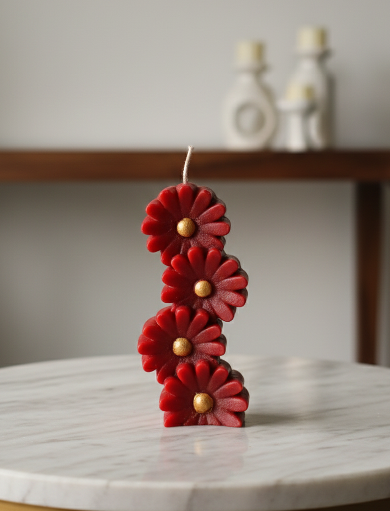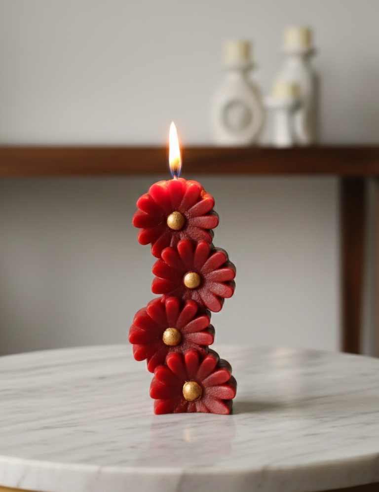 Add charm and elegance to your décor with this stacked flower-shaped decorative candle, designed with intricate floral detailing and a vibrant red finish accented by a golden center. This unique candle makes a striking décor statement while creating a warm, romantic glow.