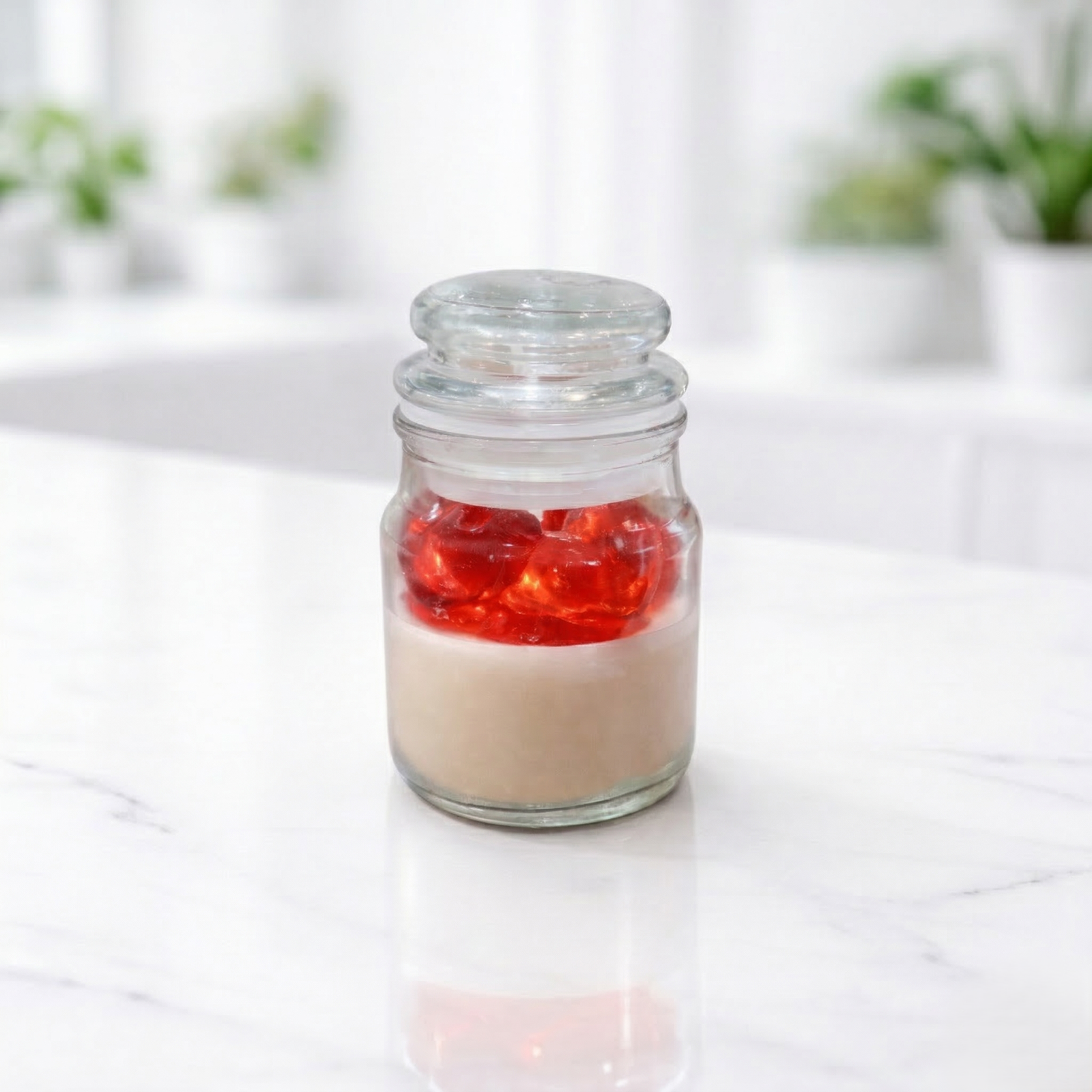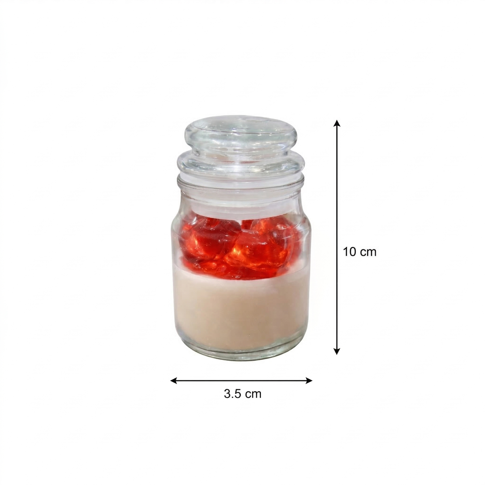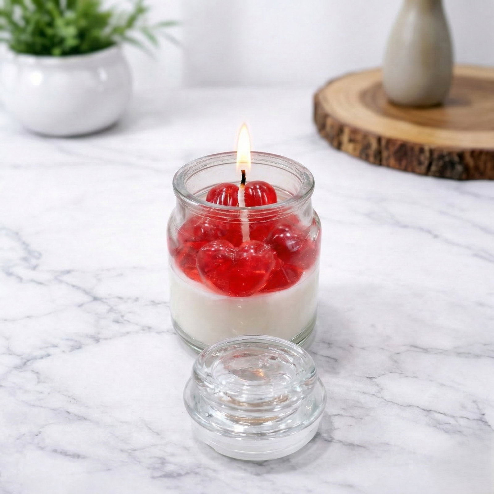 Bring warmth, love, and elegance into your space with this beautifully designed Heart Gel Candle in a Glass Jar. Crafted to enhance romantic settings, this candle features a stunning layered design with a soft white base and vibrant red gel hearts on top, symbolizing love and affection.