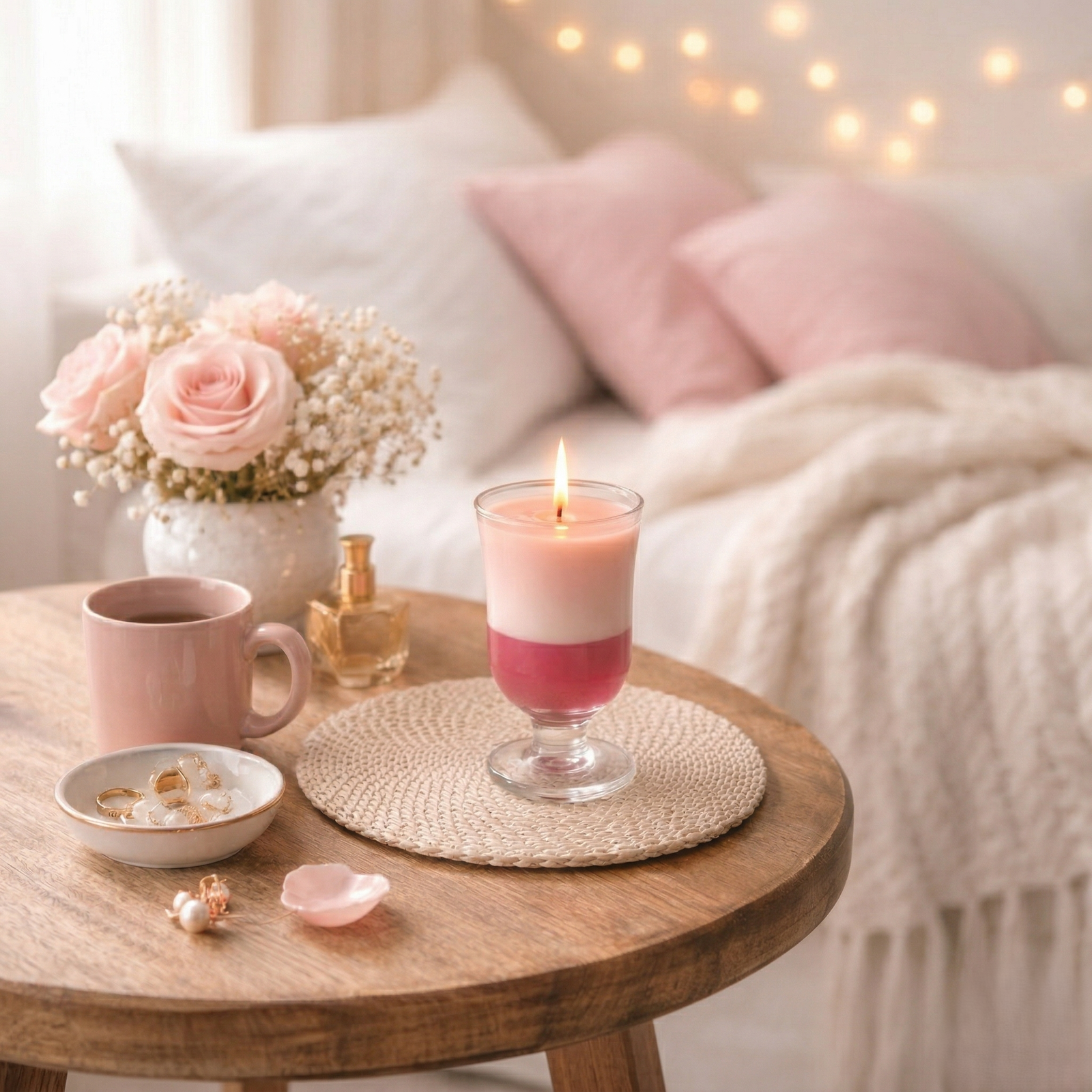 The stunning dual-layer pink design in a premium glass holder enhances its aesthetic appeal, making it a perfect décor piece for bedrooms, living rooms, or special setups. Surrounded by a romantic vibe, it’s ideal for creating memorable moments.