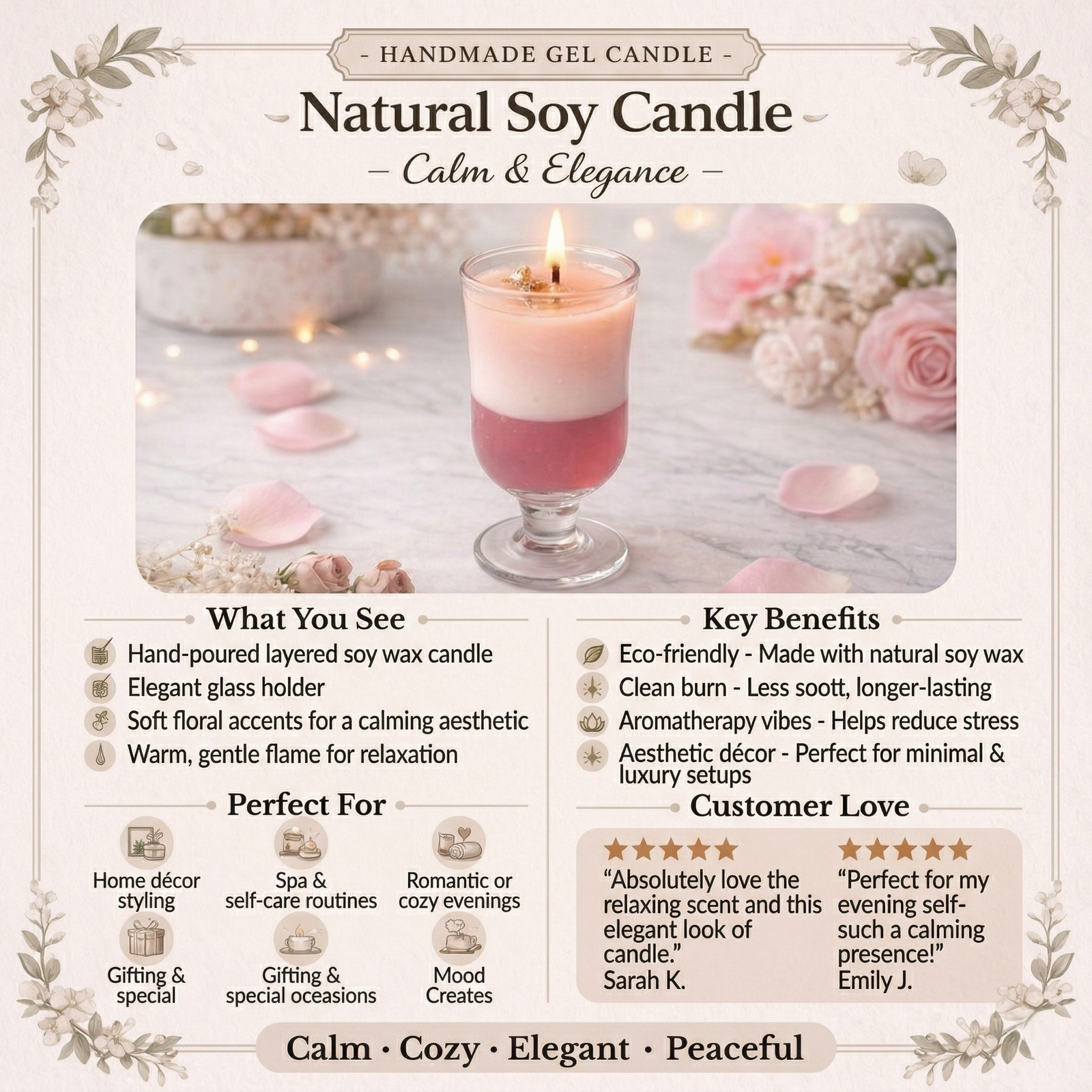 Made with high-quality wax, this candle ensures a clean, smokeless, and long-lasting burn, providing a consistent and soothing fragrance experience. Whether used for relaxation, date nights, celebrations, or everyday décor, it helps create a calm and inviting atmosphere.